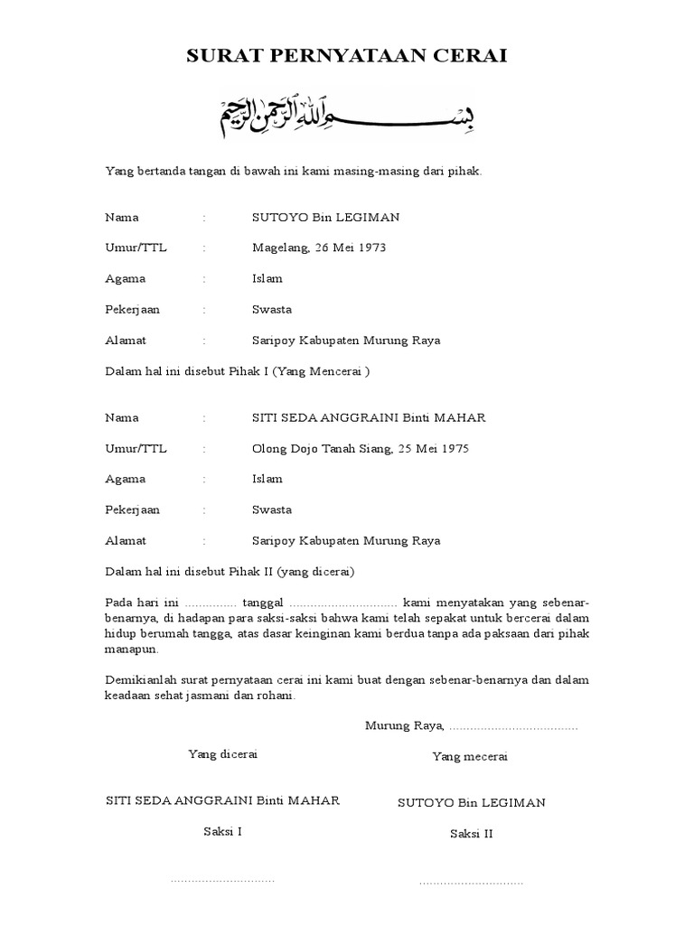 Cerai Contoh Surat Talak Nikah Siri Nusagates from noreenfraserfoundation.org Surat pernyataan cerai adalah surat yang dibentuk oleh seorang suami dan juga sang istri yang isinya ialah untuk menyatakan bahwa kedua orang yang bersangkutan telah setuju tetapkan untuk bercerai. Format contoh surat gugatan cerai (isteri yang mengajukan cerai). Contoh surat perjanjian kerjasama di berbagai bidang. Beranda » contoh surat » contoh surat cerai gugat istri. Perceraian adalah hal yang sangat tidak diinginkan oleh pasangan. Anda sedang membuka postingan contoh surat perjanjian borongan yang berada pada kategori contoh surat dengan tag postingan berikut contoh surat perjanjian borongan contoh. Dalam pembuatan surat permohonan cerai talak, bisa dilakukan oleh suami ataupun istri. Adalah istri saya yang telah saya nikahi secara sah menurut hukum dan syari'ah contoh surat pernyataan diri, kesalahan, sekolah, perjanjian dan pertanggung jawaban.